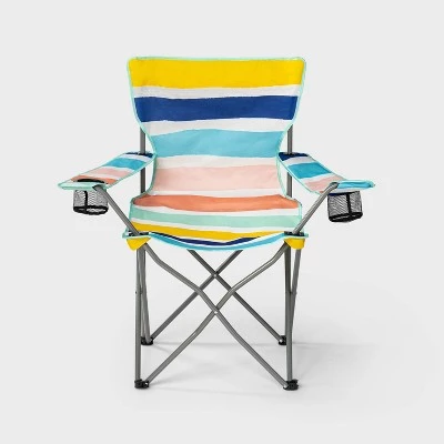 From sipping a cool drink beachside to enjoying the sunset from your deck, add comfort to your leisurely pursuits with this Adult Outdoor Portable Chair from Sun Squad™. Supported on a metal frame and featuring a wide fabric back and seat design, this outdoor chair features armrests for comfy seating, while the two mesh cup holders add functionality to it. Made from a water- and rust-resistant material to protect it from the elements, this outdoor chair is just the right pick for picnics, camping or fishing trips, beach excursions or outdoor family cookouts. Plus, it features a foldable design that lets it fit in the included carrying bag with a drawstring closure and a tote handle for easy carrying. Showcasing multicolor stripes, it’s sure to add a pop of color to your pool, deck, ball field, beach or camping site.