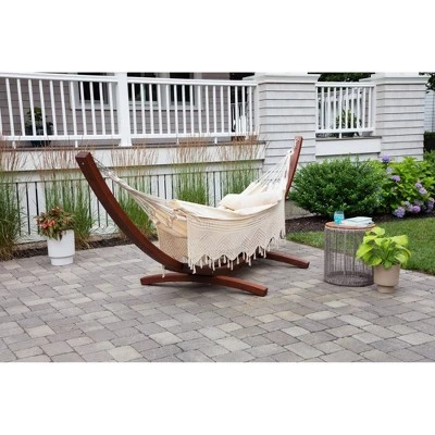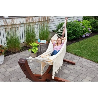 The Bahia Brazilian outdoor hammock adds comfort to the quality time that you spend outdoors. This versatile double hammock for the outside can accent your patio furniture, add more comfort to your backyard, or be your go-to lounge spot on the porch. Bring it along while traveling and relax near the campfire with this comfortable tree hammock. The durable patio swing has been handcrafted with high-grade cotton fabric and will add a bit of luxury to your life. Take a moment to enjoy the simpler things in life while you sit back and relax on this 60 x 87-inch two-person hammock. This traditional South-American hammock comes with a coordinated fabric bag for your convenience. Spend time relaxing solo or swinging with others, this patio hammock swing has a weight capacity of 450 pounds. HAMMOCK STAND SOLD SEPARATELY!