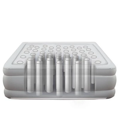 The Beautyrest® Sky Rise Air Mattress Guest Bed features offset coil design that sleeps more like a traditional mattress. Heavy-duty puncture-resistant vinyl provides peace of mind and reliability for years. The hands free powerful electric express pump quickly inflates and deflates in seconds. Includes BONUS adapter to use with other inflatables. Patented 1-touch comfort control lets you adjust from firm to plush. Plush velveteen cover helps keep sheets in place. Recommended to use deep pocket sheets. Supports up to 700 lbs. Sturdy duffel bag included. 1 Year Warranty. Queen size air mattress is 18″ high, Full size is 16″ high, Twin size is 14″ high.