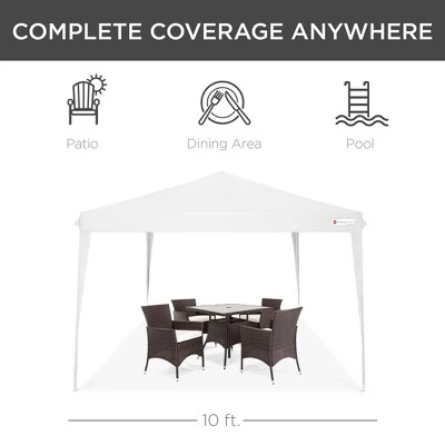 This large canopy (10x10x7.9-8.5ft) can be set up in just 10 minutes and 3 simple steps for an easy, 2-person assembly that lets you lounge in no time! The quick & easy setup comes together like so: Step 1 Open the canopy, Step 2 add fabric top and click legs in place, and Step 3 latch fabric to bottom legs. With a convenient, 8x8x48.5in carrying case included, it can be taken a variety of places such as your backyard, the park, camping, and more. A weather-resistant metal frame is made sturdy with reinforced corners and flat, mountable feet. Plus, UPF-50+ sun resistance keeps hot rays limited as you lounge. Everything needed for setup is included – such as guy ropes, hooks, and a cover – so your pool, patio, or outdoor dining space is always covered. (Note: This product is CPAI-84 Flame Retardant)