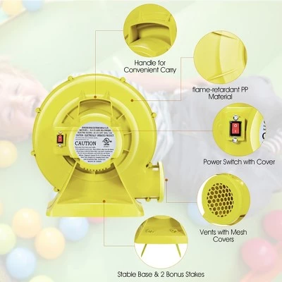 - Easy Operation & Wide Application: This electric air blower pump fan is applicable to many kinds of indoor and outdoor inflatable products, such as bounce houses, water slides, pneumatic play pools and inflatable holiday decors. The operation is very easy, just connect the air blower outlet with the filling hold and then press the power switch.