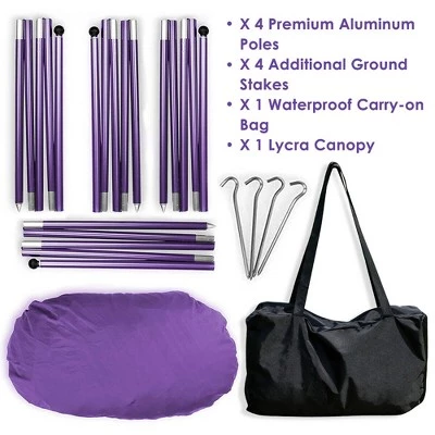 Enjoy the great outdoors while remaining almost totally protected from the sun’s harmful rays with our high-quality Lycra shelter. This shelter is easily set up and can be angled out to provide a fully covered area for relaxation during camping, fishing or beach volleyball break. This tall beach canopy is extremely light, durable, tear resistant and even water repellent for long-term use. Moreover, with metal edges, bonus sand bags and additional 4 peg stakes, the sunshade will stand firmly on the beach and other possible terrains according to your personal needs. Thousands of families are using this beach sun shelter to keep their kids safe, happy and out of the sun! It comes packed in a carry bag with a zipper and weighs only 6.5 lbs so you can sling it over your shoulder and take it anywhere !