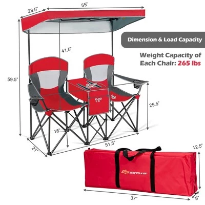 This double sunshade folding chair will provide you with large shelter and comfortable outdoor experience. Crafted of heavy-duty steel frame and premium oxford fabric, this folding chair is sturdy and fade-resistant for durable usage. It also includes a detachable canopy to block sun on hot summer days. There is a beverage holder to keep drinks cool and cup holder on both armrest of chairs. Also, a storage bag provides additional space to place items. The double chair and canopy can be folded down to a compact size and fit into a carrying bag for easy transporting. Perfect for beach, camping, backyard or anywhere you want to relax, this double sunshade folding chair is an ideal choice for you to enjoy leisure time with friend or family.