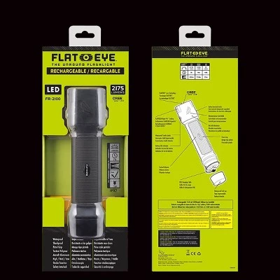 FLATEYE™ Rechargeable Flashlight provides 2175 Lumens of light on the highest setting to light your way inside or out. They are made with a polymer pistol-like grip and aircraft-grade aluminum so they they are comfortable to hold and light. The FLATEYE revelutionary design is great to carry in your hand, tool belt, pocket or backpack but the greatest part is when you set it down it stays in place and doesn’t roll around. They are Waterproof up to 1m and Shockproof up to 3m and carry the USB cable in the bottom cap end.