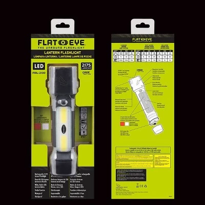 FLATEYE™ Rechargeable Flashlight with Lantern provides 2175 Lumens of light on the highest setting to light your way inside or out. It also has a lantern feature that has both Red and White LEDs. They are made with a polymer pistol-like grip and aircraft-grade aluminum so they they are comfortable to hold and light. The FLATEYE revelutionary design is great to carry in your hand, tool belt, pocket or backpack but the greatest part is when you set it down it stays in place and doesn’t roll around. They are Waterproof up to 1m and Shockproof up to 3m and carry the USB cable in the bottom cap end.