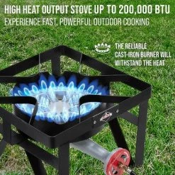 - Cook breakfast, lunch, and dinner outdoors with igniter button and combined 20,000 BTU burner power; Features: 2 stove control knobs and piezo igniter button