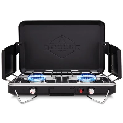 Take your campfire cooking to new heights with this convenient stovetop appliance from Hike Crew. Designed to work without any electricity, this handy unit allows you to connect your own propane gas cylinder and get the convenience of stovetop sautéing, frying, and boiling, no matter where your travels take you. Each individual burner has its own igniter and adjustable heat dial, giving you individualized control over the flame. The lid and sides fold up to create a unique windscreen that prevents the elements from blowing out your stovetop flame, and also shields your cooking from dirt and debris. A standard-issue gas regulator and hose are included with your purchase, so all you need to provide is your own propane! Fold-out legs and an integrated drip tray help to keep your stovetop clean and stable while preparing meals, while the high-performance burners deliver up to 10,000 BTU of cooking power each. The powder-coated finish keeps the unit looking great, and the included carrying bag ensures you can easily transport it from place to place. Keep serving up delicious meals, even when you’re off the grid!