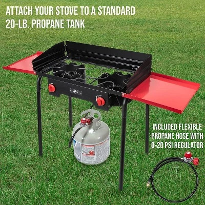 - Attach your stove to a standard 20-lb. Propane tank; Included flexible propane hose with 0-20 psi regulator