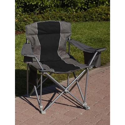 1,000-lb. stationary weight capacity*, Additional center frame support ensures durability and support, Rigid components stand up to the stress of normal use, Heavy-duty, super sturdy 22mm tubed frame, High quality, fully padded 600-denier polyester fabric distributes weight evenly across frame, Oversize shatter-proof nylon feet provide traction for added stability, Drawstring mesh pocket (approx. 14″w x 15″l) attached to chair back stores handy essentials, Left armrest has zippered cooler, Right armrest has oversize gadget/cup holder, lower mesh side pocket, Includes drawstring storage/tote bag with shoulder sling, Seat: 26.5″w x 23″d