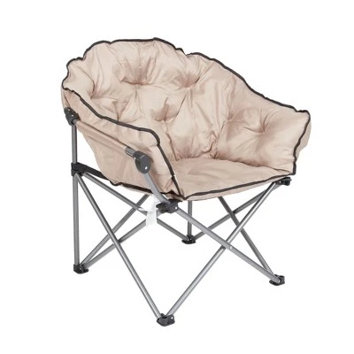 - Features a padded tufted seat and a larger seating area than most fold up chairs