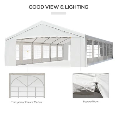 Transform an ordinary gathering into the extraordinary with a fun and practical party tent from Outsunny. This extra large canopy tent features a powder-coated steel frame for superior strength and rust-resistance. A durable, UV-resistant polyester fabric roof and sidewalls allow for easy cleaning and keep the harsh sun away. It features a removable, zippered entrance and PVC windows to allow plenty of air and light in. Reinforced steel pipes and ground pipes provide added durability to the entire structure. Use it at your next party, wedding or BBQ to turn any setting into an exceptional event!; NOTE: This tent cover is meant for sun shade purposes only and should NEVER be left up in windy, rainy, or snowy conditions. Please collapse your tent when the weather is windy.