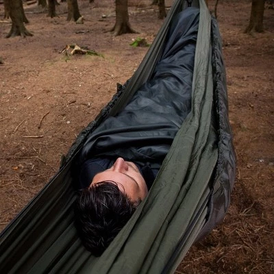 The Snugpak Hammock Quilt is designed to offer you the warmth and comfort of a sleeping bag without the struggle of climbing into a sleeping bag on a hammock. The quilt’s spacious dimensions are 71 inches long by 43 inches wide to offer you plenty of room to move while you sleep. The Hammock Quilt is equipped with insulated flaps that you can tuck down on each side of you to secure the quilt in place and prevent drafts. The quilt also features a specialized foot pocket that begins just after the insulated flaps so that you can slide your legs in up to the knee. The pocket offers your feet and lower legs protection on all sides from cold weather; protecting your extremities is incredibly important in winter conditions. The Hammock Quilt is filled with Travelsoft insulation that is washable, lightweight, and has super fine filaments that trap and retain heat even when wet. The quilt can be compressed for long periods of time in the included compression stuff sack without the Travelsoft insulation losing its thermal properties. For a completely insulated hammock shell, use the Hammock Quilt with the Hammock Under Blanket. The Snugpak Hammock can be used with any hammock.