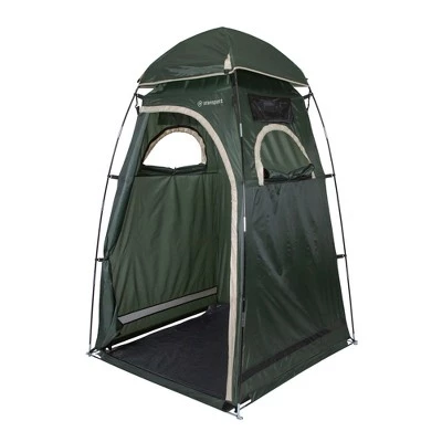 This well-constructed, Deluxe Privacy Shelter is perfect for a day at the beach, by the pool, in the back yard or for any campsite. Shock-corded fiberglass poles are easily secured to the tent with quick set-up clips. The large size provides plenty of room, while being light weight and self-supporting. It also features a removable floor, side two-way windows, stake out rings, and large zippered “D” style door for easy access. Stuff bag included.