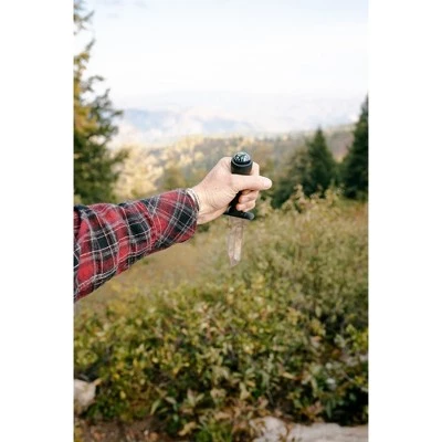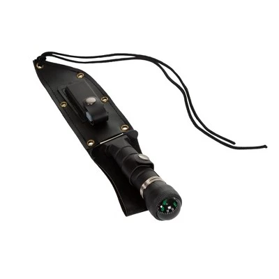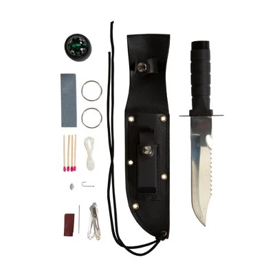 A compact survival kit with a 6″ polished steel blade with sawtooth edge and bottle opener. Made out of impact ABS plastic with a hollow handle and watertight screw on cap. Includes: matches with striking pad, wire ring saw, fish hook and lead, nylon fishing line, needle, liquid filled compass, sharpening stone, sheath with belt loop.