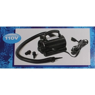 The Swimline 110V Air Pump is a handheld, electric air pump perfect for large inflatables. A high-capacity electric pump, it can inflate or deflate your Swimline or other floats in minutes.This pump comes with a multi-use nozzle set and can handle a variety of inflatables. Simply connect the nozzle to the “inflate” connection or “deflate” to store your floats for later usage.The cord extends out 12 feet, allowing you greater mobility and freedom to use it inside or out.Get a handy pump that can inflate or deflate all your inflatables, the Swimline 110V Air Pump.