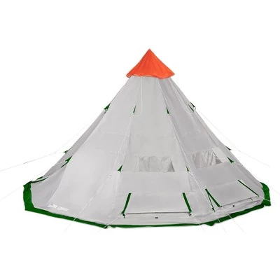 The Tahoe Gear Bighorn XL Cone Tent is a conical shelter that’s waterproof and easy to set up at a camp ground, music festival, or even your own backyard.The cone shape of the tent comes from the unique center pole designs. The shape provides extra space that rectangular tents can’t, allows the rain and debris to slide right off, and has a reinforced water resistant peak ventilation system. The Bighorn XL works especially hard to keep you dry with its waterproofed windows, water resistant fabric, and polyethylene floor that prevents water ingress.The tent sleeps up to 12 at a time and comes with a steel pole, carry bag, and stakes. Traditionally cone tent sleepers have lied down with their feet facing the center pole, like the spokes of a wheel.The door zips shut and has a protective flap to protect from leakage. There are 4 PVC windows, multiple floor vents, and mesh roof panels and is fully ventilated so you won’t get humid or sticky. There are 4 PVC windows, multiple floor vents, and mesh roof panels and is fully ventilated so you won’t get humid or sticky. The beige and black colors are attractive and blend in with their surroundings, making it easy to enjoy the outdoors without sticking out.The Cone Tent is made of 1000mm polyester, which provides the best combination of weight, carry size, cost, and protection from the elements. The polyethylene floor is waterproof, and more durable than other tent materials. When properly set up, it can withstand winds of up to 35 mph and will provide a dry environment for almost any rain storm.Tahoe Gear’s goal is to create quality outdoor goods that exceed your expectations at an unrivaled value. When the time comes for your next adventure, Tahoe Gear is there to help you make the most of it and escape the indoors. Take the Tahoe Gear Bighorn XL Cone Tent with you on your next adventure.