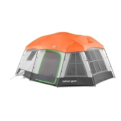 Explore, sit by the fire, eat s’mores, watch the sunset, hike, go fishing, and catch some Zzz’s in the Tahoe Gear Ozark 16-Person 3-Season Tent at the end of your adventure-filled day.Great for comfortably sleeping from up to 16 people, the Ozark is ideal for camping with friends or family or even for a longer outdoor excursion. Enjoy day time in the airy, open screen room or a few restful hours in the separate master suite area. Equipped with easy setup poles, stakes, guy ropes, and a rainfly for unexpected weather, this tent has it all. A generous 7-foot center and tall wall height allow you and fellow campers to move around easily and have plenty of space. The Ozark has many windows, floor vents, and an open mesh design to get some major air flow during the day and night.If you’d rather be camping, grab some good company and setup the Tahoe Gear Ozark Tent.